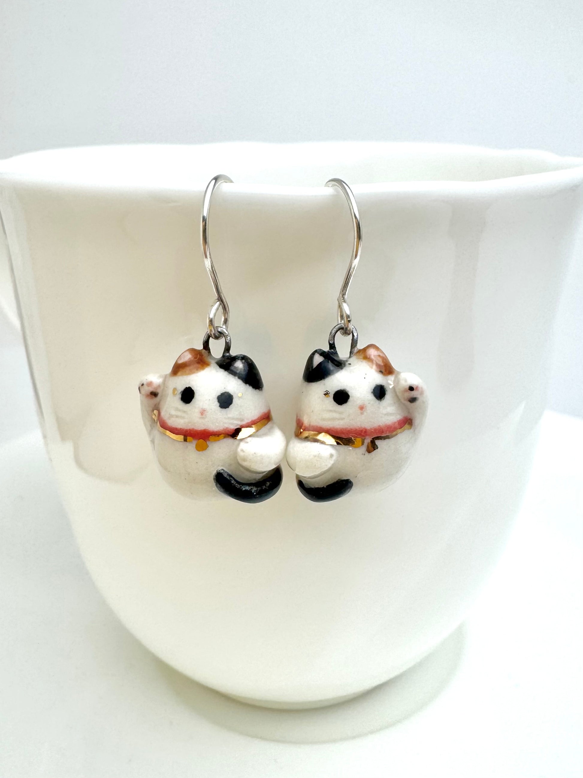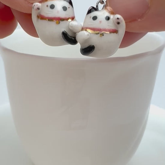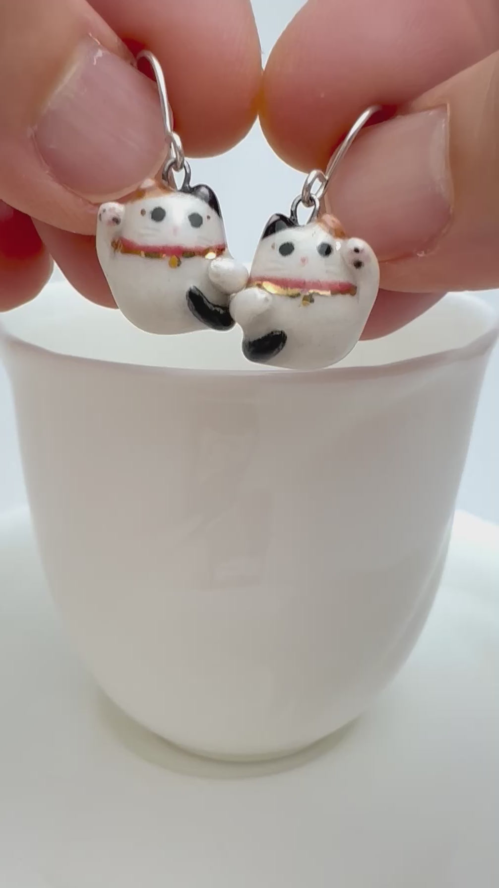 The earring charms are handmade with porcelain clay. They are fired twice with underglaze colors and a high-fire clear glaze. Each charm is about 1/2” (1.27 cm) in length, and they are attached to either sterling silver or gold-filled ear wires.